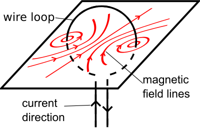 The magnetic filed lines produced by the current in the wire loop