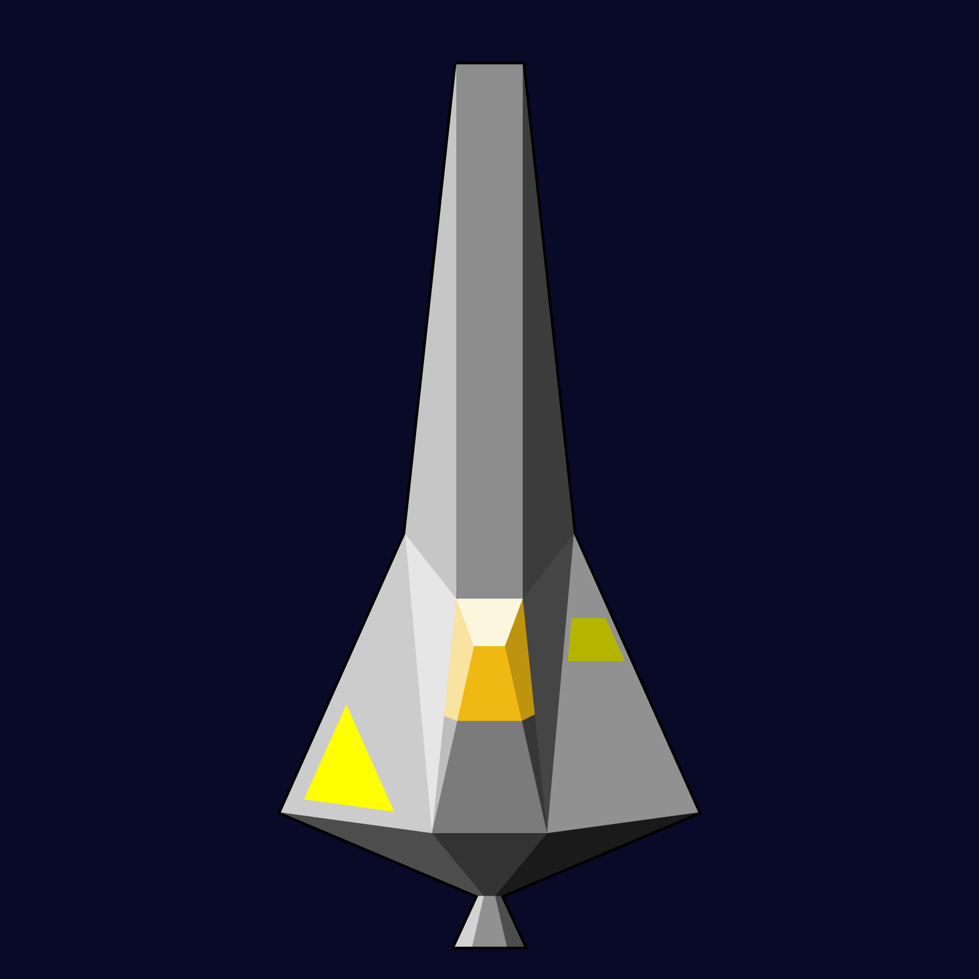 Top-down view of a single-seater space craft. The craft is grey with yellow markings. Its hull consists of polygonal pieces.