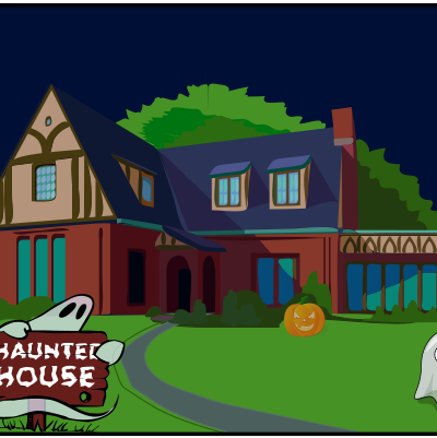Haunted house illustration with ghosts.
