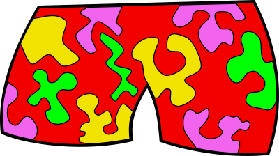 Red shorts with splash patterns.