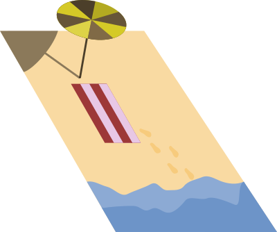 A beach seen from an above perspective, with beach umbrella, beach towel and footsteps.
