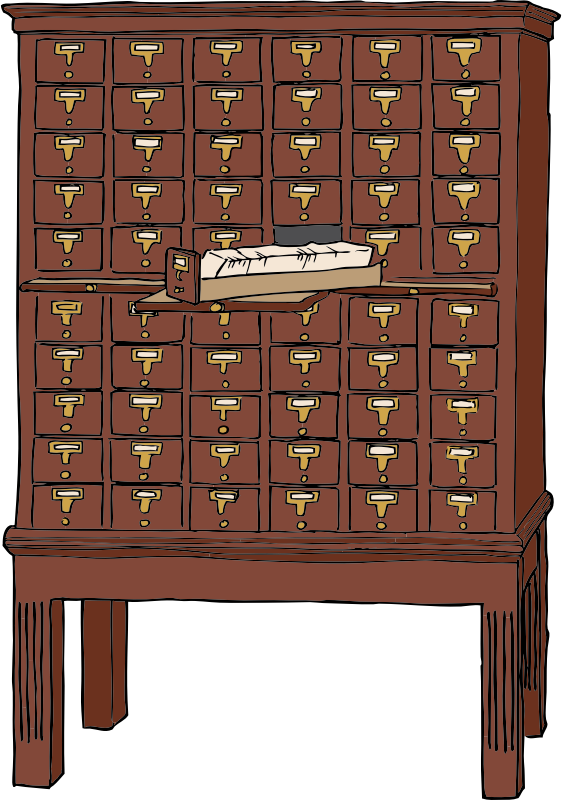 Color drawing of an old wood library card catalog