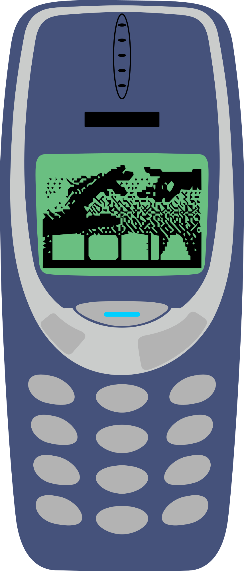 An older model cellphone with a black and white lcd screen with low resolution.