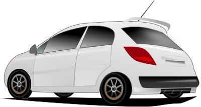 A white rally car viewed from behind and the side.