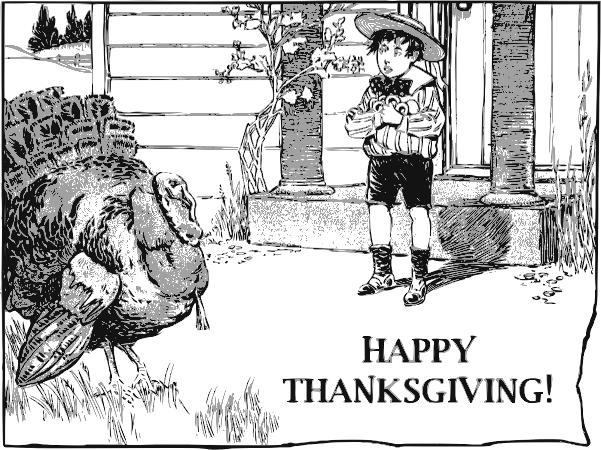 A boy and his turkey share the field. The turkey looks out at us, as if judging us for our future crimes. Synthesized from a 1906 Los Angeles Herald newspaper illustration, thus safely in the public domain.