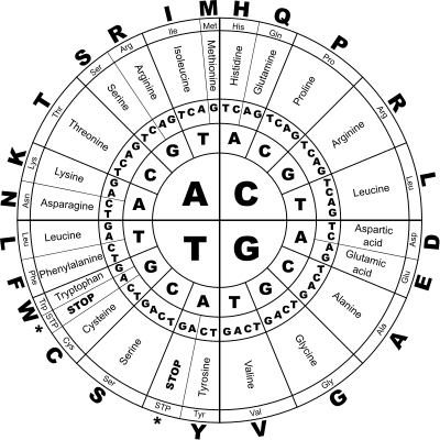 How to read the genetic code: start from the center circle and go outwards. So, if the gene has an AGC, that means amino acid serine. A CGA means arginine. And three of the combinations are stop codons, which don't give any amino acid: TAA, TAG, and TGA.