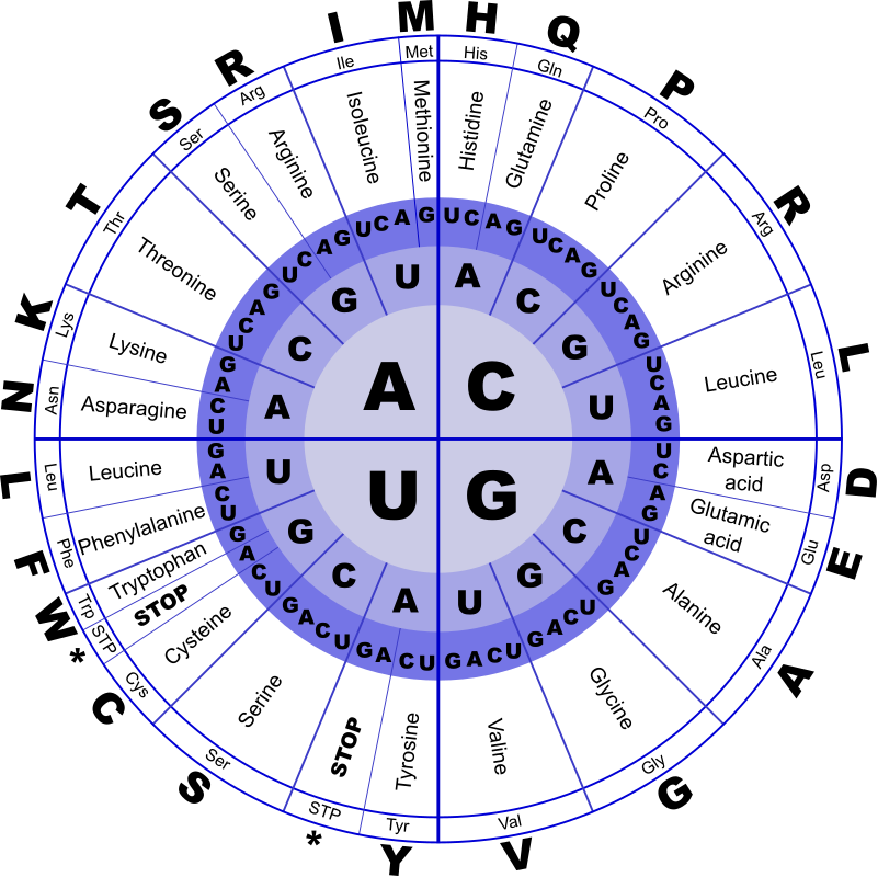 The genetic code, in RNA letters (U instead of T), and containing amino acids in three representations: full name, 3-letter abbreviation, and 1-letter. Drawn in Inkscape.